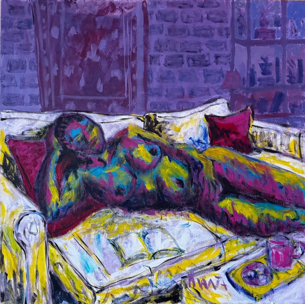 a quiet rebellion in softness and stretch marks, she’s nude, nourished, and holy—no cape, no chaos—just tea, thighs, and tenderness.